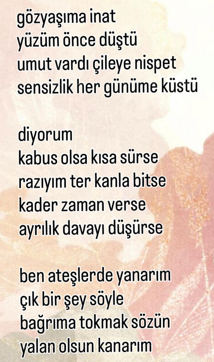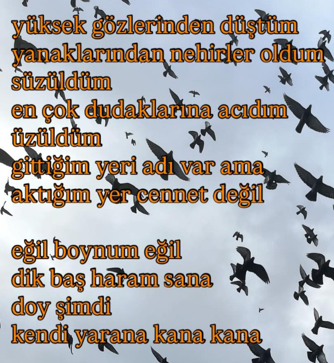 sen çığlıklara bensiz maruz. ben sadece şiirlerimde sana aruz. senin kadar güçlü olup, sen gibi göğüs gerebilsem, belki de sonsuza dek varız.